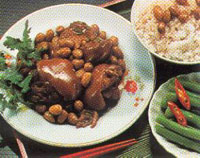將豬腳洗淨入水川燙後冷卻放入 油鍋炸至金黃色後撈起放入大鍋 中加入香滷料、醬油、冰糖、 蒜、薑、蔥、辣椒、花生等,小 火慢燉40-50分鐘即可。